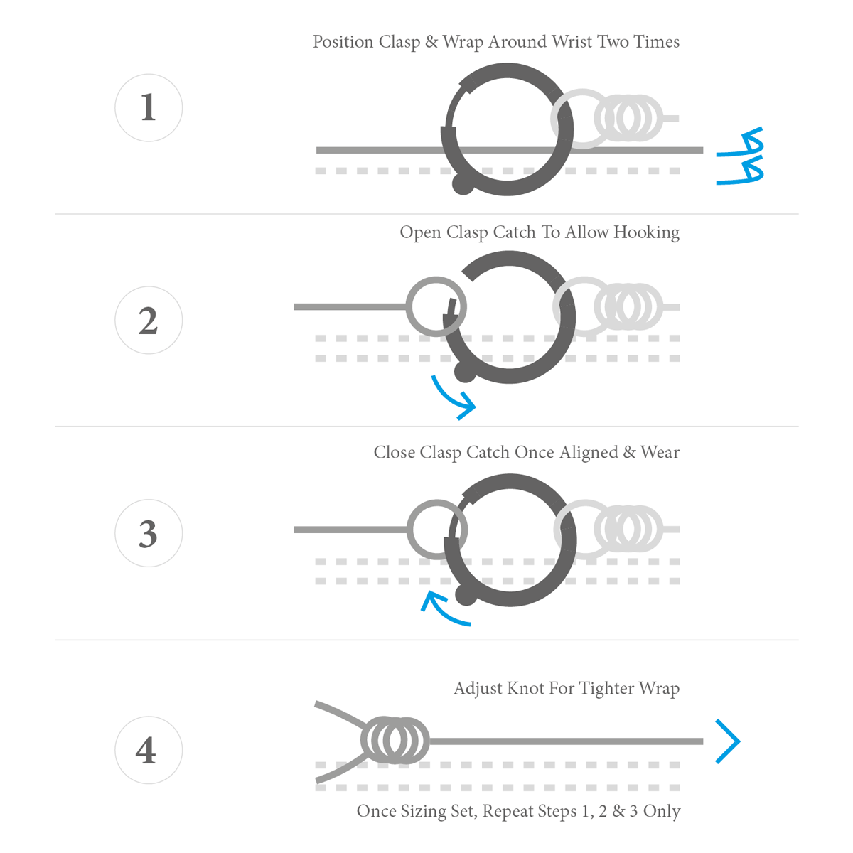 This bracelet is one size fits all, with the leather able to extend or tighten to suit your wrist size. To take the bracelet on or off your wrist, simply slide the one adjustable knot around the leather to make the loop size smaller or larger. Once set, keep the loop size consistent and simply slide the latch within the clasp and feed the rope into or out of the toggle.